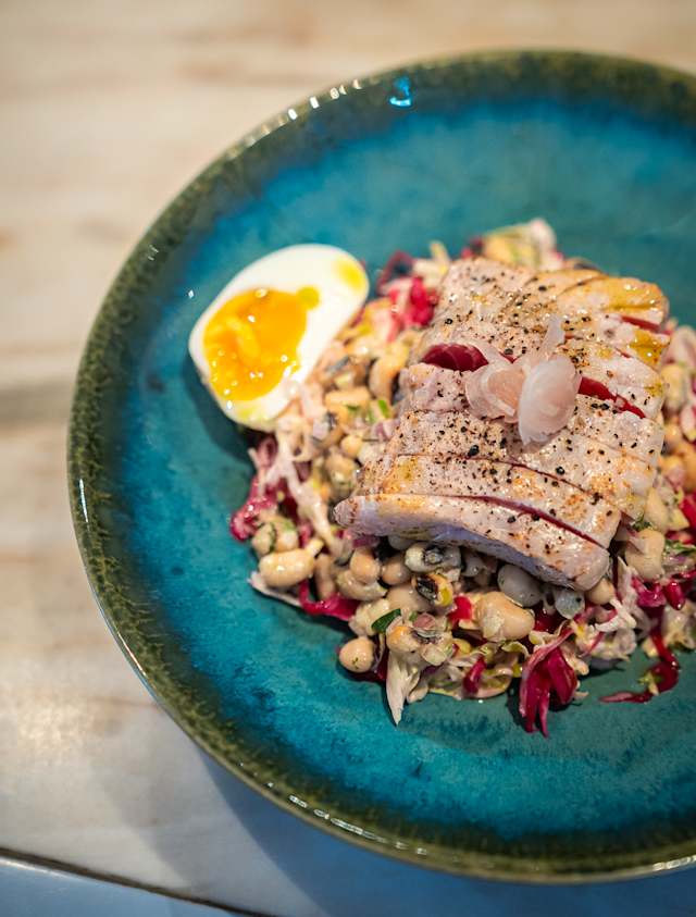 - Bochecha de atum, feijão frade, maionese picante, ovo e coleslaw