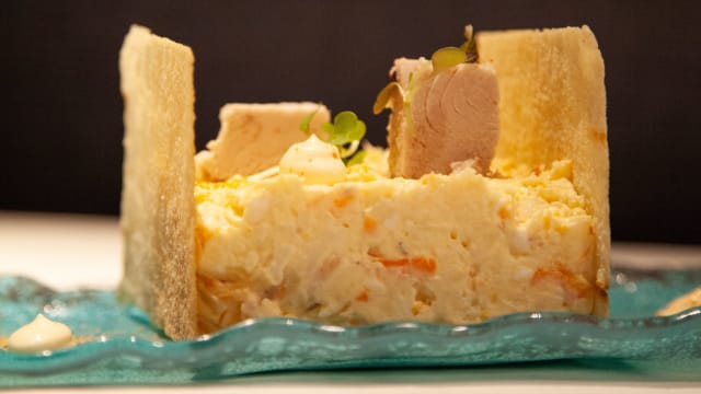 Pastel templado de centollo y buey de mar