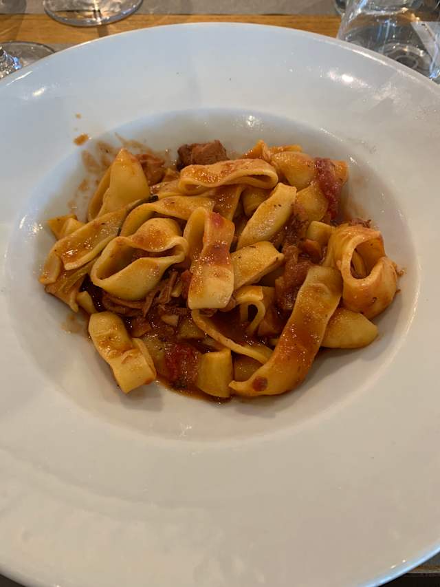 Calamarata con ragù di polpo al pomodoro datterino bruciato, soffritto di ortaggi, rifinito con olio extravergine