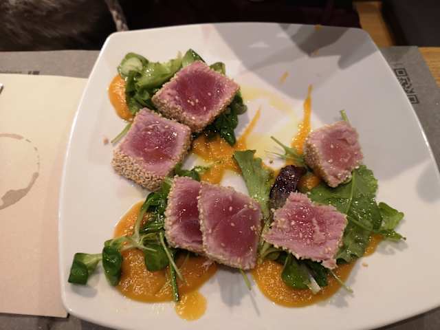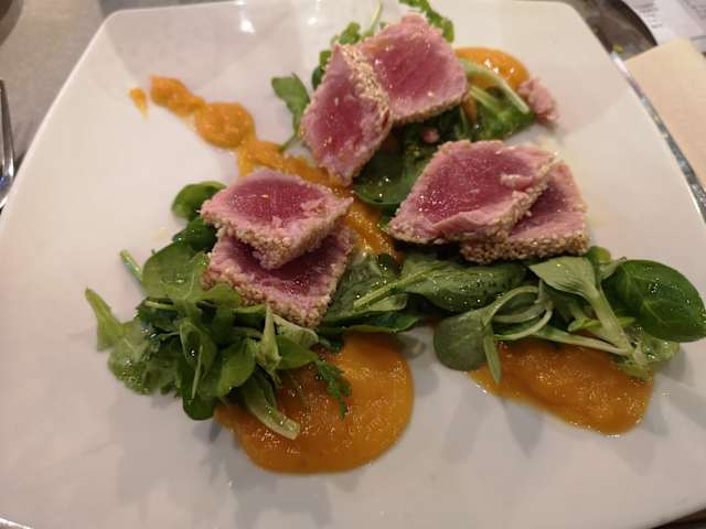 Tonno scottato al sesamo con crema di patate dolci al rosmarino, insalatina al vermouth e olio al limone