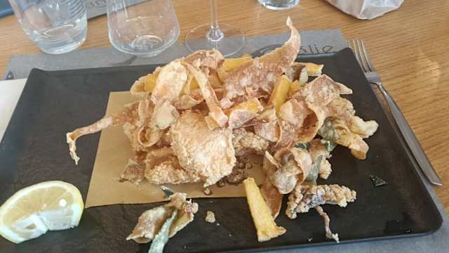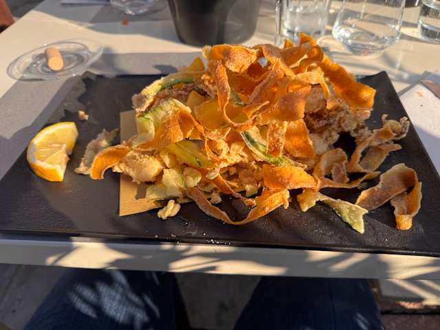 Calamari e gamberi con zucchine e carote in pastella leggera, con polentina di mais ottofile croccante