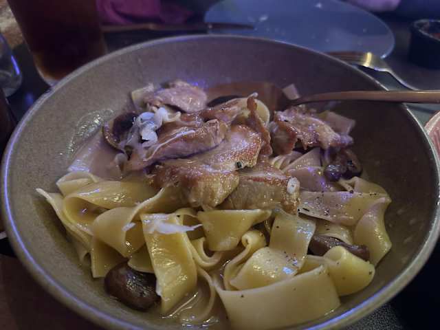 - Pasta trofie en salsa de san simón, pollo frito estilo sureño bañado en crema de cheddar