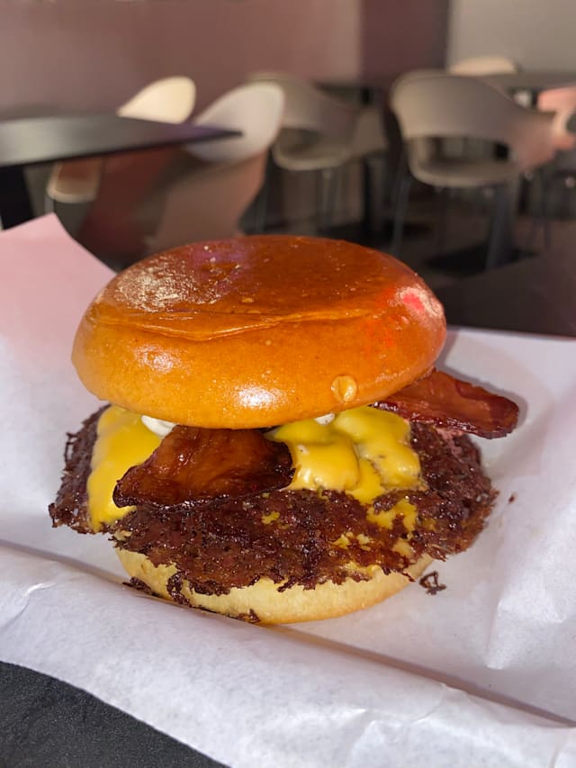 200 g de carne de vaca madurada 30 días, doble de queso cheddar rojo maduro, escamas de queso parmesano, nuest ra mahonesa trufada y bacon ahumado crujiente