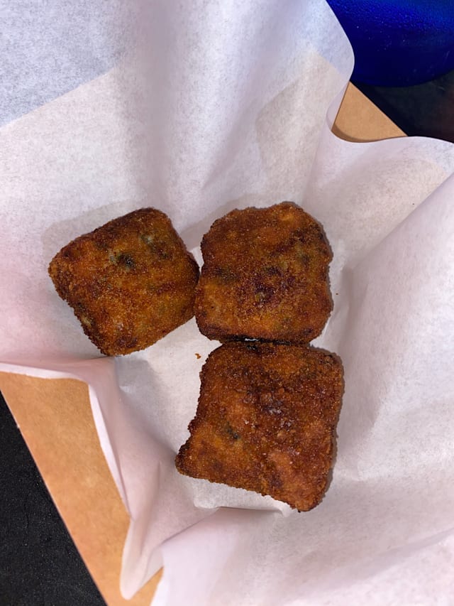 Pechuga de pollo rebozada al toque de la casa, salsa supreme, mermelada de bacon y pepinillos