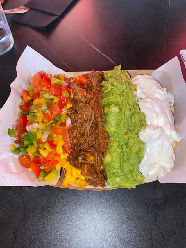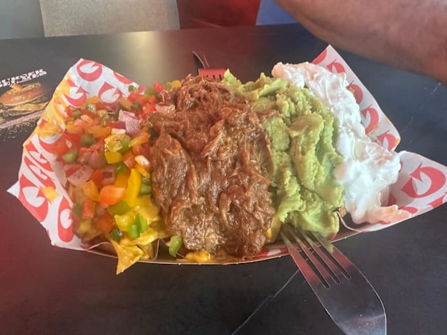 200 g de carne de vaca madurada 30 días, doble de queso cheddar rojo maduro, salsa bbq al bourbon y una sabrosa costilla de cerdo deshilachada bañada en bbq