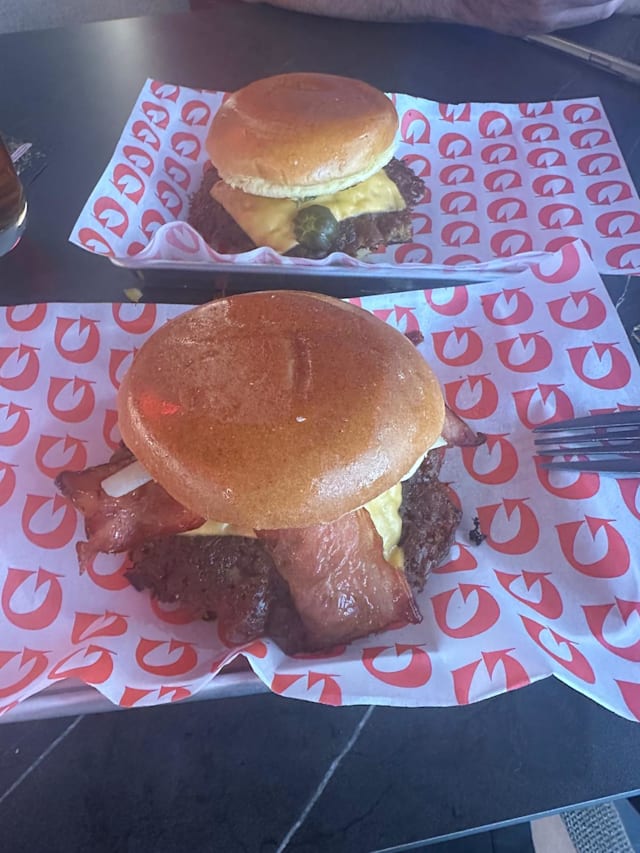 200 g de carne madurada 30 días, doble de queso cheddar rojo maduro, mermelada de bacon, pepinillos agridulces y salsa gula.