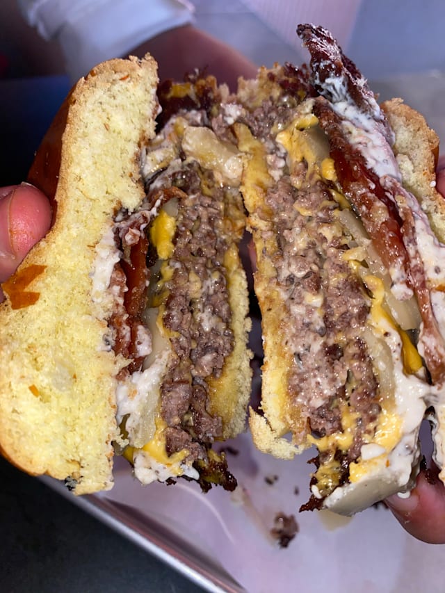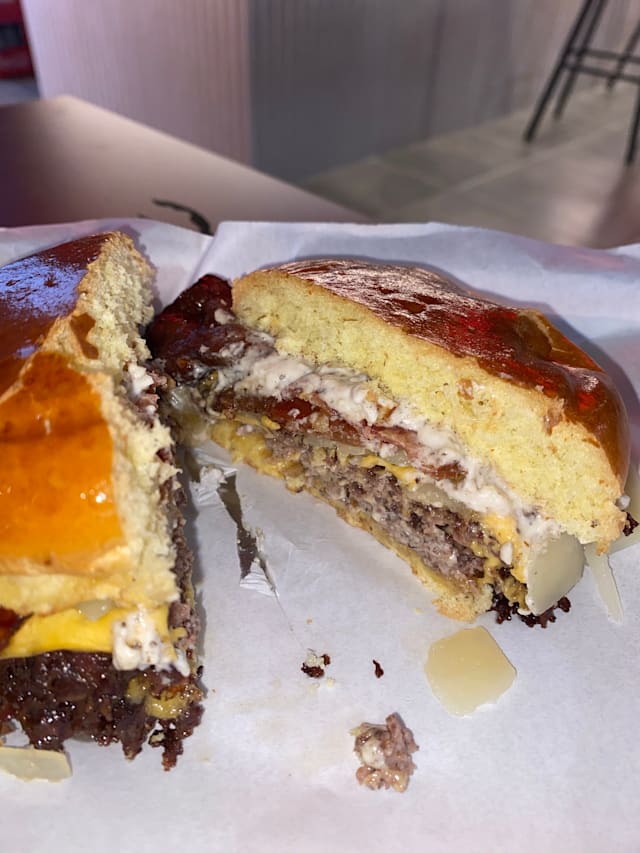 200 g de carne de vaca madurada smasheada 30 días con cebolla, doble de queso cheddar rojo maduro, cebolla morada mandolinada y salsa burger casera