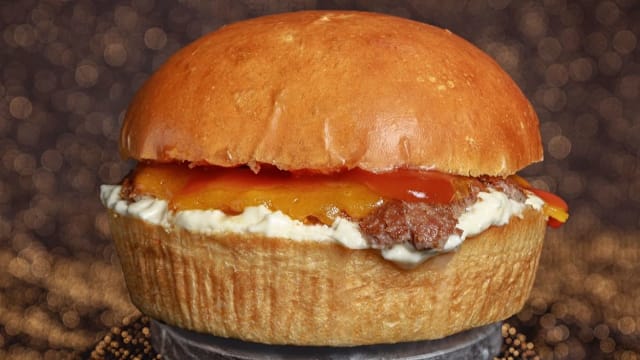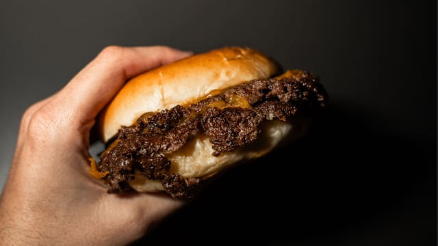 Salsa golden, cebolla caramelizada, un disco de carne smash, cheddar y pan brioche.