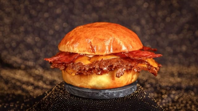 Doble smash dry aged de 100 gr cada disco, salsa de bacon, mermelada sweet bacon, cheddas y bacon ahumado crunchy en nuestro pan brioche.