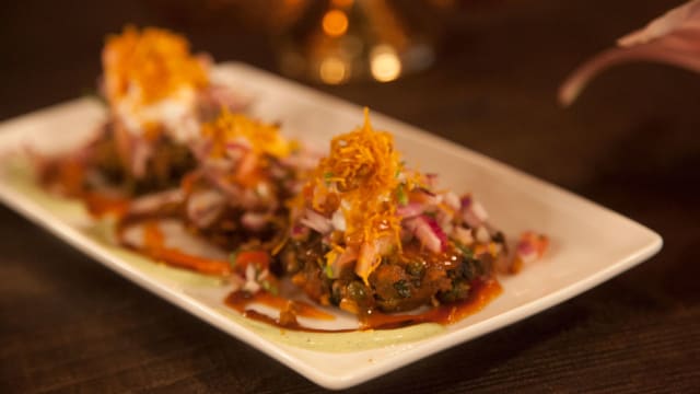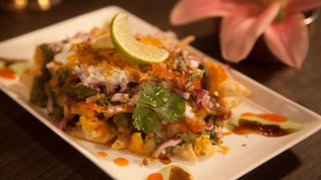 - "street food" van gefrituurde crackers met aardappelen, yoghurt, uien, chutney's en kruiden als toppings