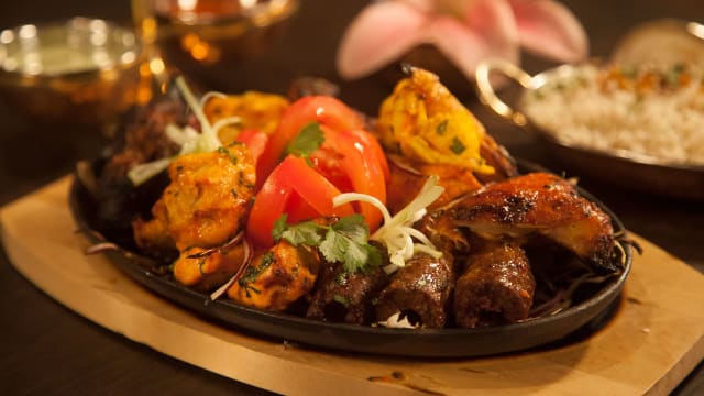 - Combinatie van tandoori chicken, chicken tikka, seekh kebab, lamb tikka en lamskoteletten