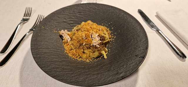 I paccheri fatti in casa si uniscono ad un ragù ricco e saporito esaltato dal tocco raffinato del tartufo nero, in un piatto che celebra i sapori autunnali.