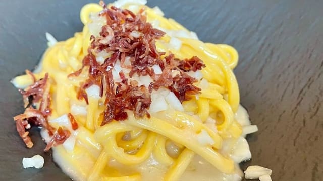 Con fonduta al gorgonzola e guanciale