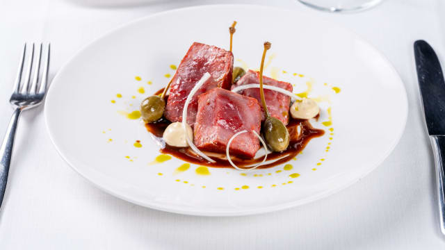Battuta di cavallo, millefoglie di patate, maionese alla pizzaiola e papaya