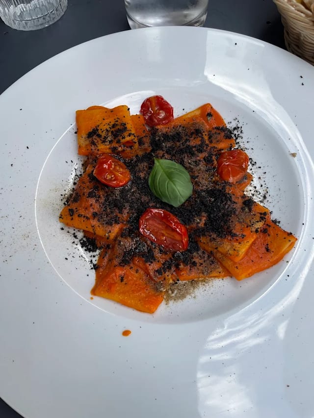Pomodori pelati, guanciale, fonduta di pecorino, pepe nerо