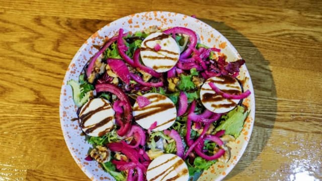 Mezclum, queso de cabra, cebolla roja, nueces, vinagreta y balsámica.