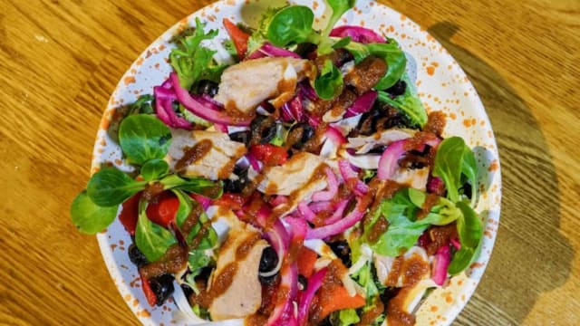 Ensalada mezclum, ventresca de atun, pimiento asado, aceitunas negra, cebolla fresca y vinagreta de tomate secco.