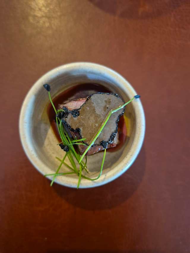 Crema di melanzane, fior di latte di agerola, lardo paesano, katsuobushi