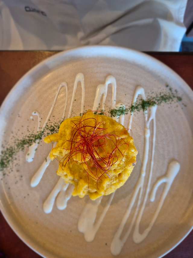 Provola di agerola, fiori di zucca ripieni di ricotta, pepe e provola, tartare di manzo, fonduta di parmigiano, basilico e olio EVO