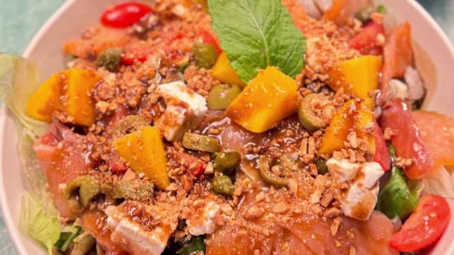 - Alface, salmão fumado, tomate cherry, queijo feta, manga, azeitonas, alcaparras, amêndoas caramelizadas e vinagrete.