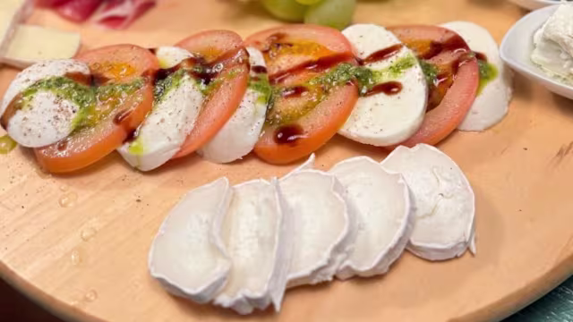 - Tomate, mozzarella fiore di latte, mozzarella de búfula, tomate cherry e manjericão.