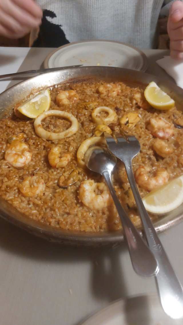 - Paella con pollo, gambas, mejillones y costilla de cerdo