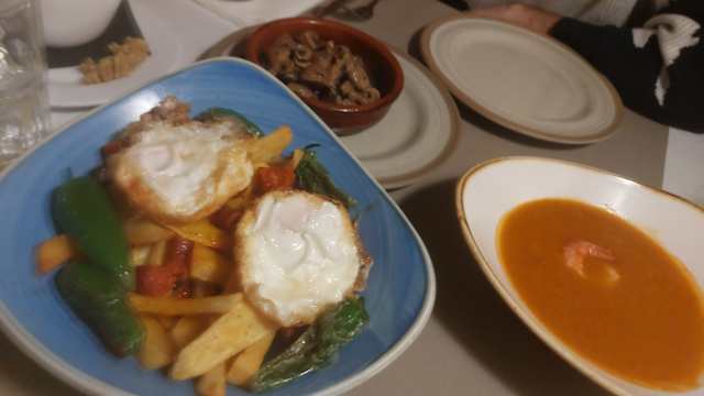 - Ensalada de pulpo, con tomate, cebolla, atún, boquerones, olivas y lechugas variadas