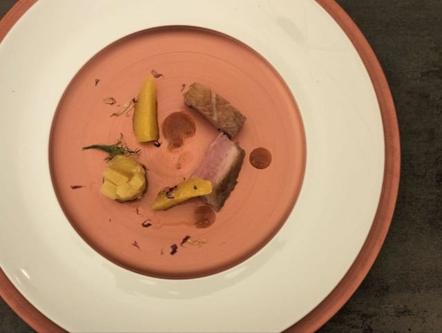 - Scaloppa di petto di anatra in cbt , chutney di ananas, salsa miele e arancia navel
