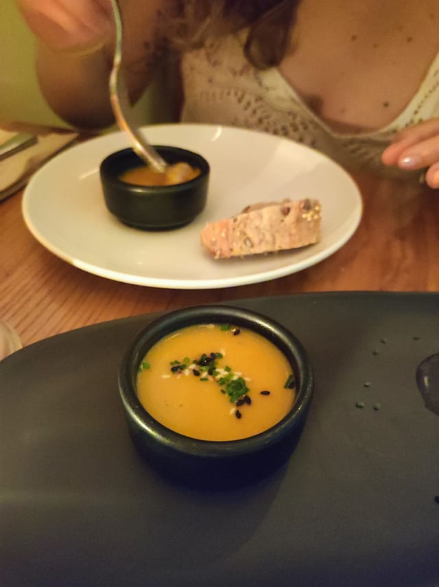 10/10Very inviting place with dimmed lights at dinner time that makes it feel cozy. It is a good place to go on a special occasion or a date. We were a group of people ordering different dishes but they were all very tasty! The Thai noodles with egg was creamy and delicious. I would say that quantity wise one dish may well not be sufficient but surely you will be paying for quality. They also have variety of ecological wines and you could also ask for a suggestion. I didn’t like the dessert white wine, it was too sweet. The red wines were bomb.