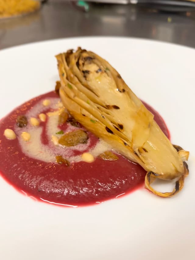 Indivia alla griglia con crema barbabietola in agrodolce, emulsione di pinoli e uva sultanina