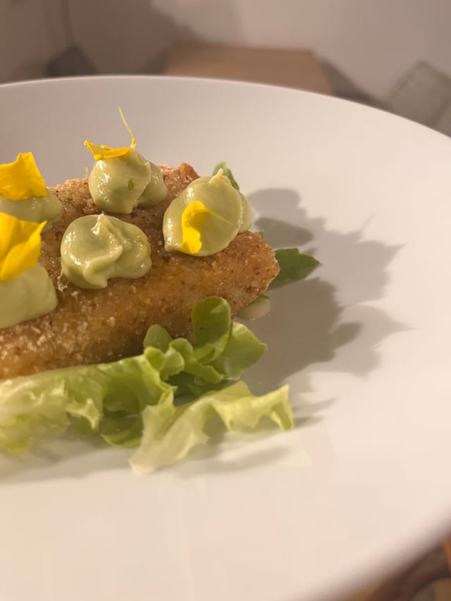 Sedano rapa in crosta con misticanza con senape e crema di avocado