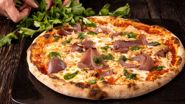 Salsa di pomodorini al basilico / mozzarella “fior di latte” / tonno / cipolla rossa marinata / pesto al prezzemolo