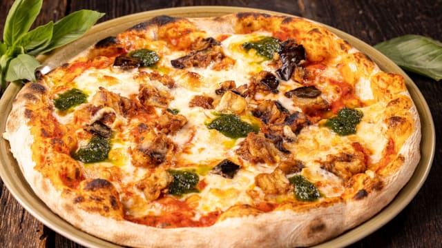 Salsa di pomodorini al basilico / mozzarella “fior di latte” / scamorza affumicata / pesto al basilico / melanzane fritte