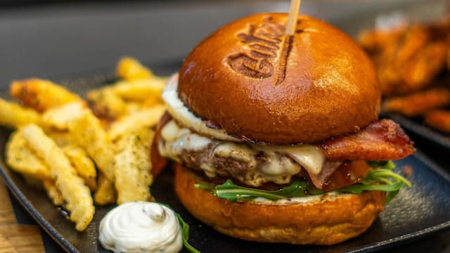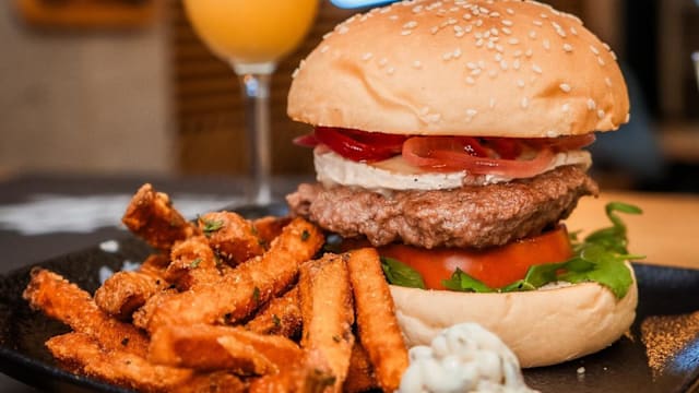 Hambúrguer 100% novilho angus, rúcola, tomate fresco, queijo flamengo, bacon, fiambre, feito em pão broche com ovo estrelado