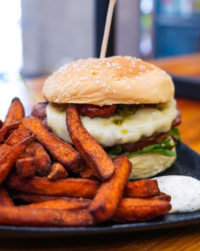 Bolo do caco, carne de novilho grelhada, queijo da ilha, queijo cheddar, ananás dos açores grelhado, mo- lho vinagrete e chips de banana da madeira. Escolha o acompanhamento