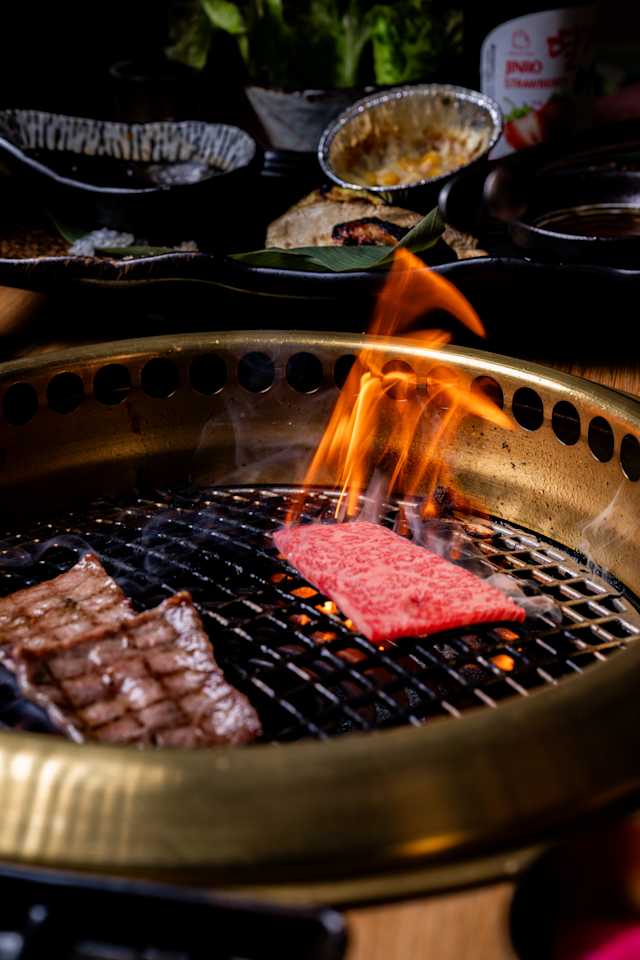 - Ternera de wagyu con salsa bulgogi, zanahoria, brócoli, setas, ajo y yema de huevo.