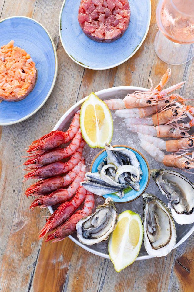 1 tartare di tonno, 1 tartare di salmone, 1 tartare di ricciola, 7 gamberi viola, 7 gamberi rossi, 7 scampi, 5 ostriche, alici marinate.