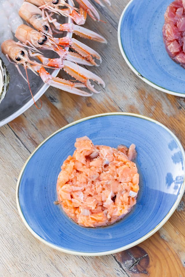 1 tartare di tonno, 1 tartare di salmone, 4 gamberi viola, 4 gamberi rossi, 4 scampi, 2 ostriche, alici marinate.