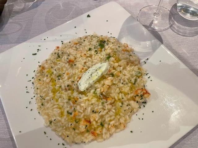Carpaccio di ricciola, nuvola di zucchine marinate menta e limone, briciole di pane spadellato alle alici