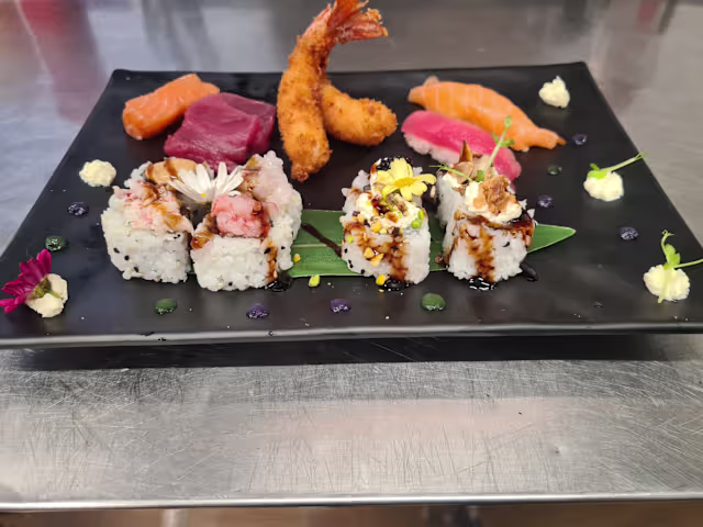 - Roll 8 pz. inside: salmone, avocado top: salmone scottato finitura: teriyaki pennellata contrasto caldo/freddo elegante: la cremosità dell’avocado incontra il salmone scottato, con una nota umami delicata che avvolge senza coprire.