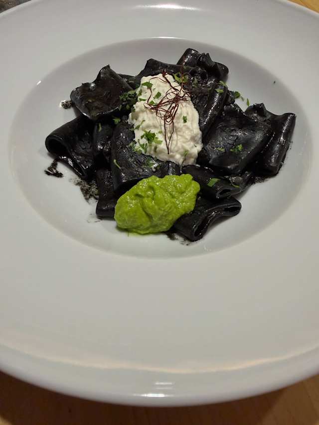 - Tonnarello mantecato alla bisque di gambero su letto di nero di seppia, salicornia croccante e dadolata di gambero rosso