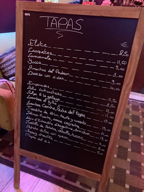 9.5/10This is a great tapas (and drinks, beer, wine) bar! Three of us ordered about 6 different tapas and we devoured every morsel! The food menu changes, written on a blackboard, but about 15-20 small plates were available ranging in price from 8-19 Euros the night we visited