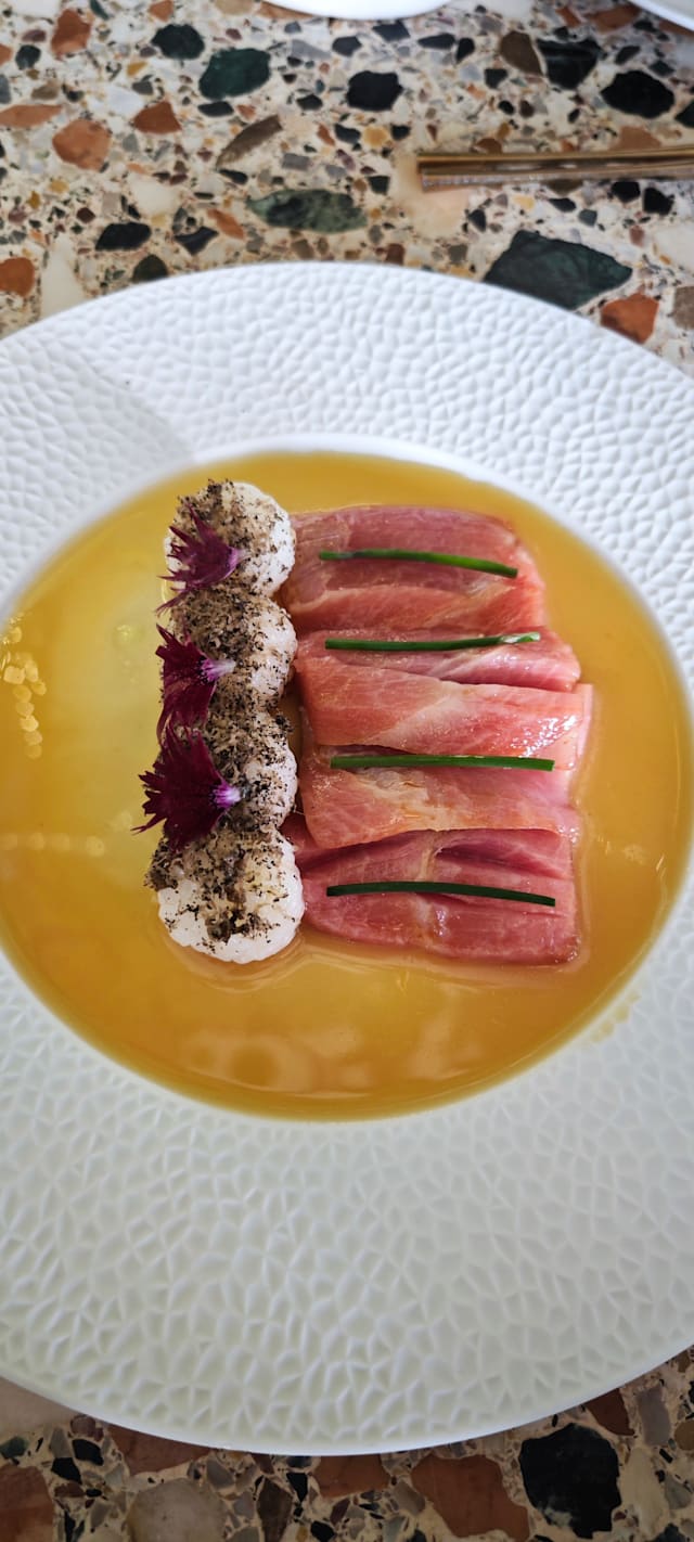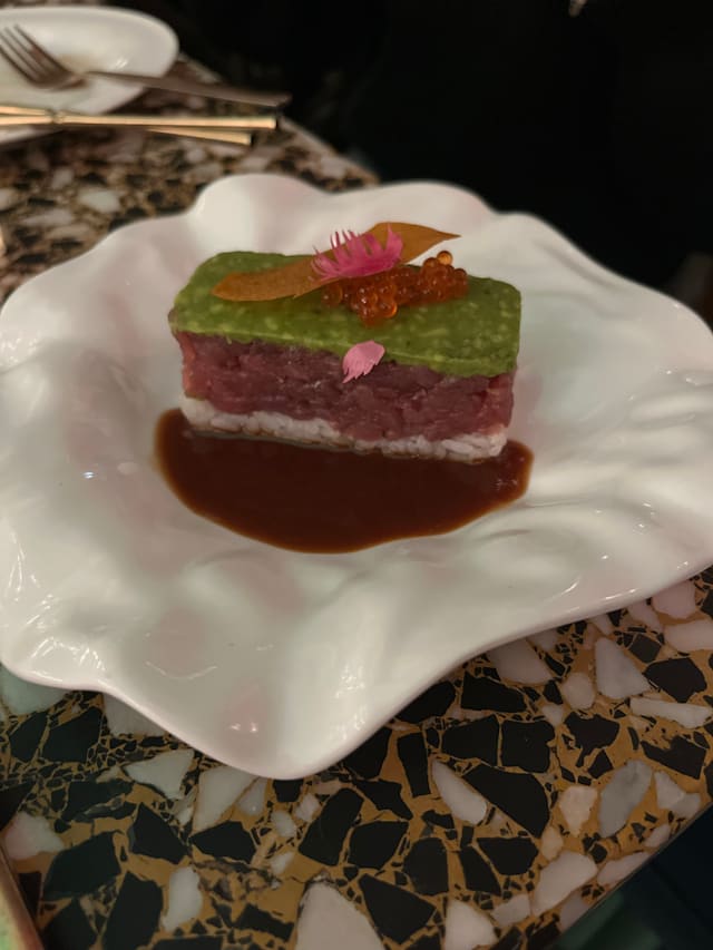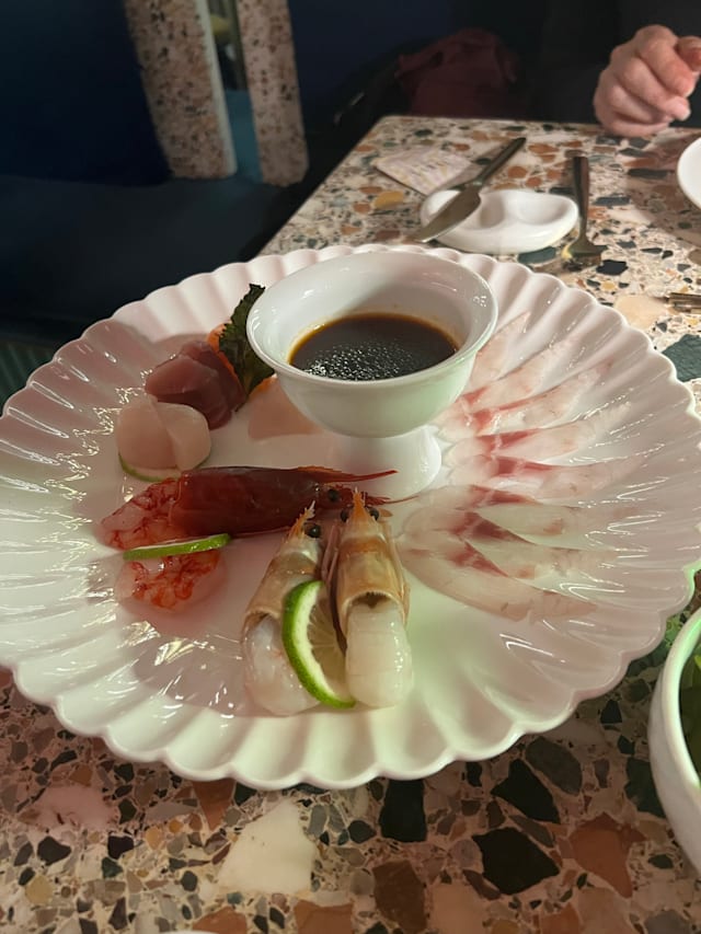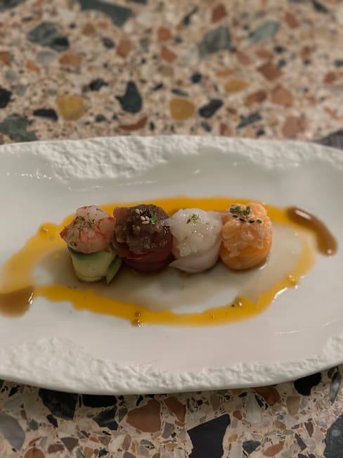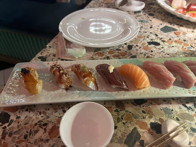 4.5/10Don’t expect to eat and satisfy your appetite! The portions are minuscule e.g 2 (!) pieces of dim sum in a sauce for 8 euros, 2 tiny tacos with tuna and drops of burratta for 8 euro , had 2 others (10 and 12 euros) just as tiny. So tiny that it was almost impossible to distinguish the tastes involved… A 30ml. Sake for 7 euros! Paid 58 euros and left hungry! The king is naked, folks, I can’t understand the 9.5 review….