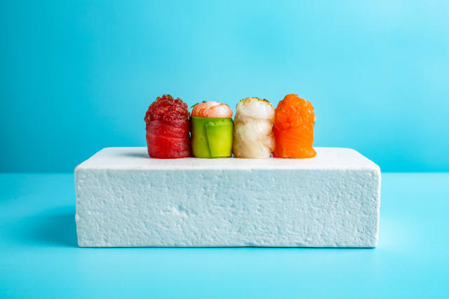 Avocado e fagiolini in tempura all'interno, carpaccio di ricciola, maionese di chipotle messicano affumicato, teriyaki all'umeshu, guacamole, ikura* e olio rosso al pomodoro
