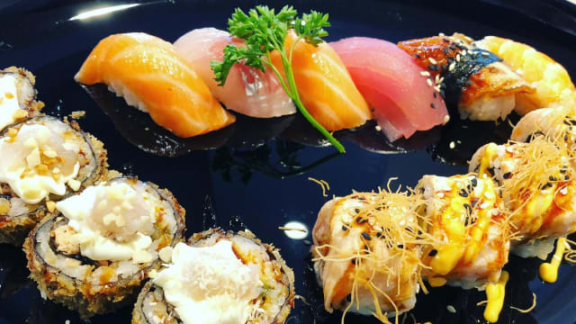 10 pezzi di sashimi misto, 6 pezzi di nigiri misti, 4 pezzi di sake ebi fly, 6 pezzi di nido fly, 8 pezzi di uramaki ebiten fly, 4 pezzi di gunkan all’olio di tartufo