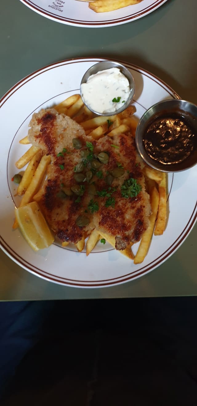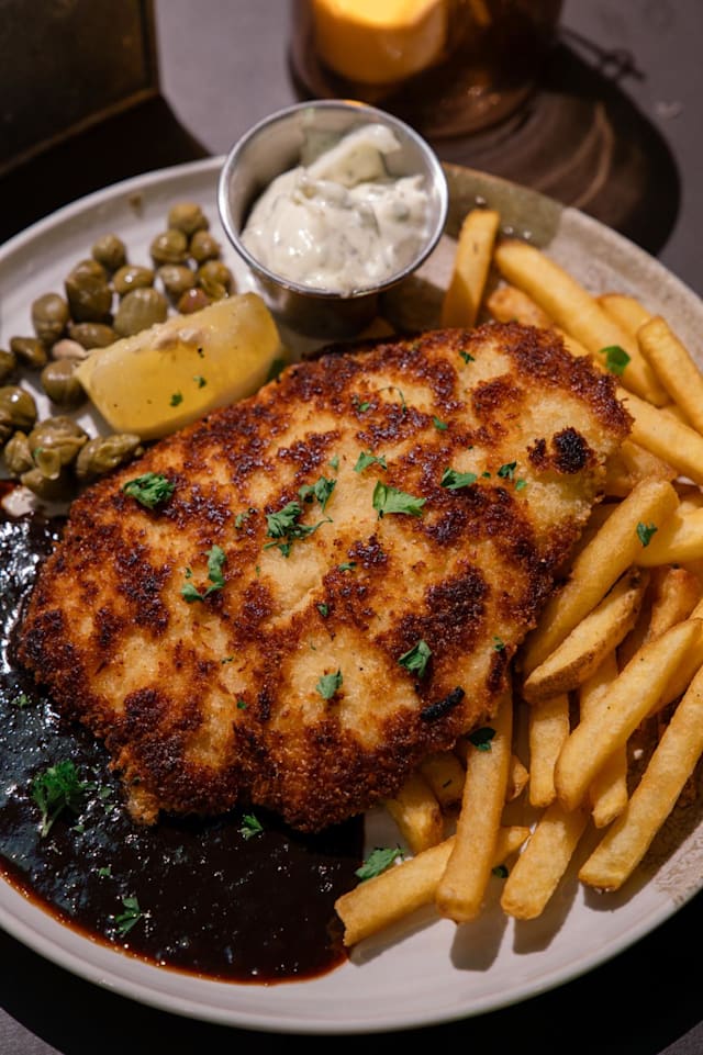 Panerad fläsk med stekpotatis, bearnaise & rödvinsås