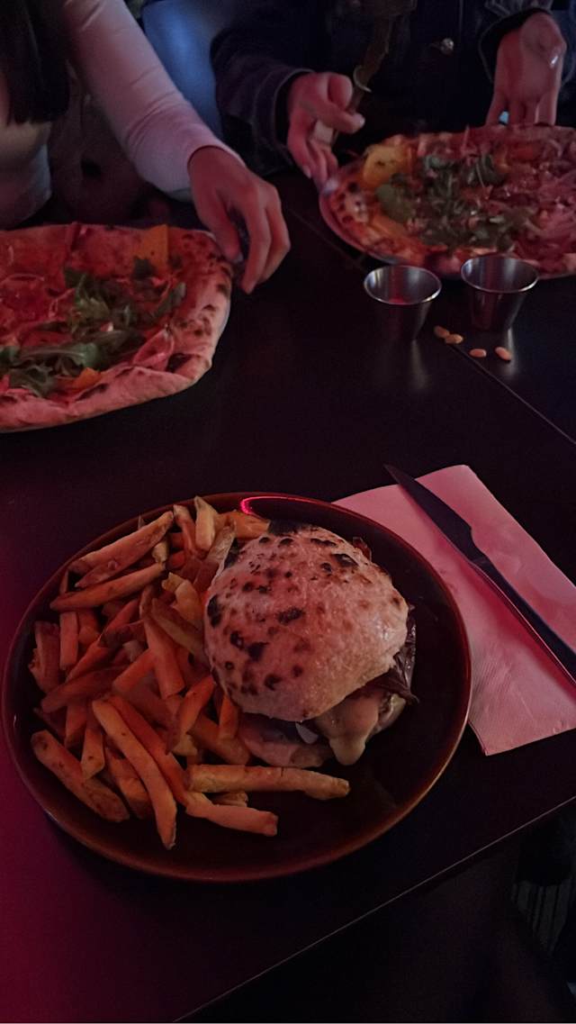 Pan casero, mayonesa, rúcula. 2 cares ecológicas al estilo smashed, pistachos caramelizados. 2 quesos italianos, scamorza ahumada y burrata ahumada local