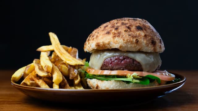 Carne 100% ecológica, pan casero, queso edam, cebolla caramelizada al brandy, lechuga. Tomate rosa y nuestra salsa especial de mostaza antigua