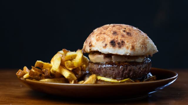 Carne 100% ecológica, pan casero, micuit de pato, manzana golden a la plancha, cebolla caramelizada al brandy y nuestra saisa especial harakiri