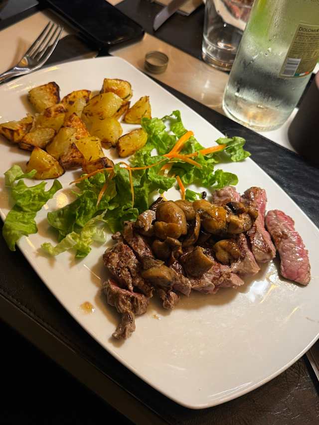 - Bistecca di manzo, marinata in olio EVO e salsa di soia, aromatizzata al rosmarino, aglio, pepe, cotta alla griglia con contorno di patate al forno